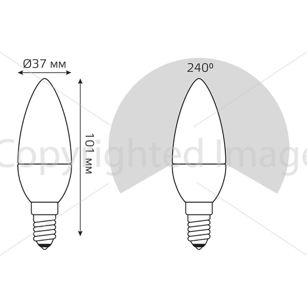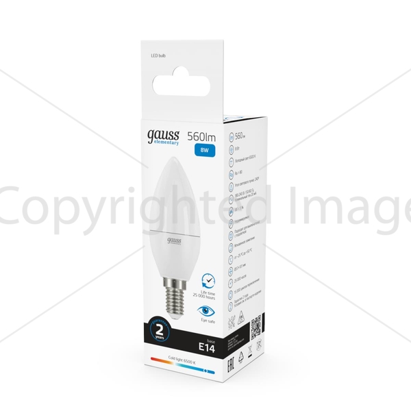 Светодиодная лампочка .в форме свечи с цоколем E14 и размерами 98 мм по высоте и диаметром в 37 мм обладает мощностью в 8 W, благодаря чему она может осветить 4 кв. м. Цветовая температура – 6500 К, т.е. холодный свет синего оттенка (не рекомендуется для применения на кухне, так как искажает цвет готовых блюд). Изделие рассчитано на использование в сети с переменным напряжением в 220-240В.