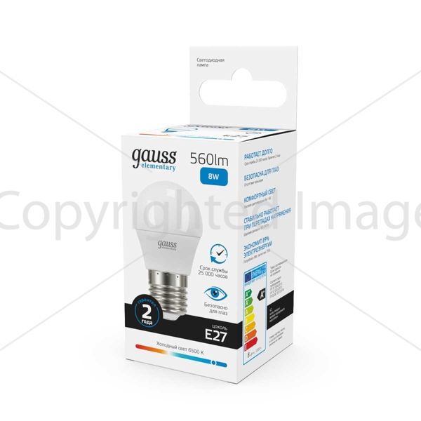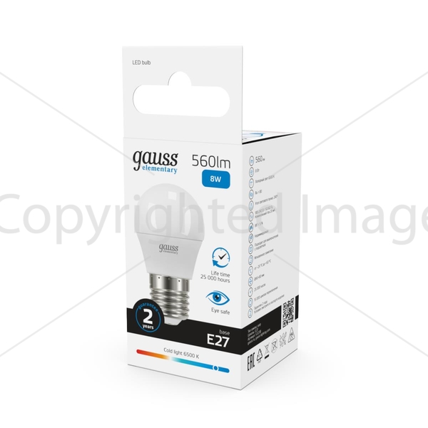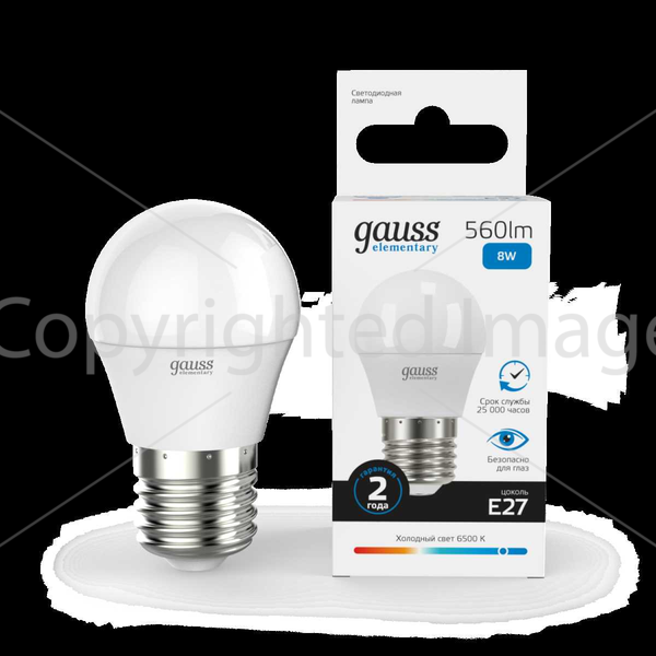Светодиодная лампочка .в форме шара с цоколем E27 и размерами 82 мм по высоте и диаметром в 45 мм обладает мощностью в 8 W, благодаря чему она может осветить 4 кв. м. Цветовая температура – 6500 К, т.е. холодный свет синего оттенка (не рекомендуется для применения на кухне, так как искажает цвет готовых блюд). Изделие рассчитано на использование в сети с переменным напряжением в 220-240В.