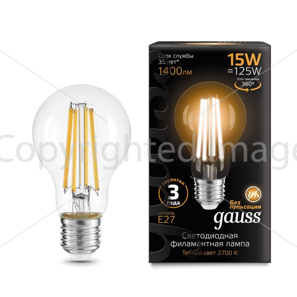 Лампа светодиодная филаментная Gauss E27 15W 2700K прозрачная 102902115