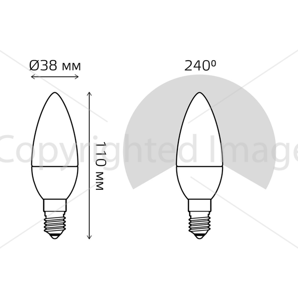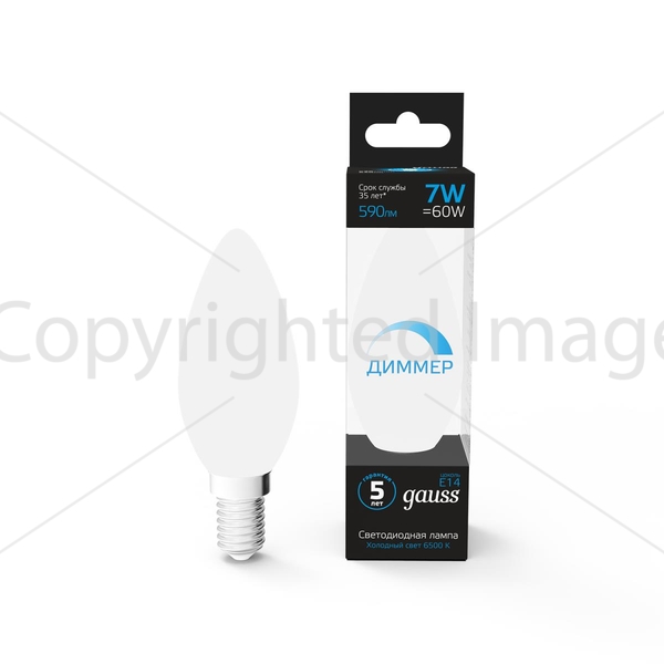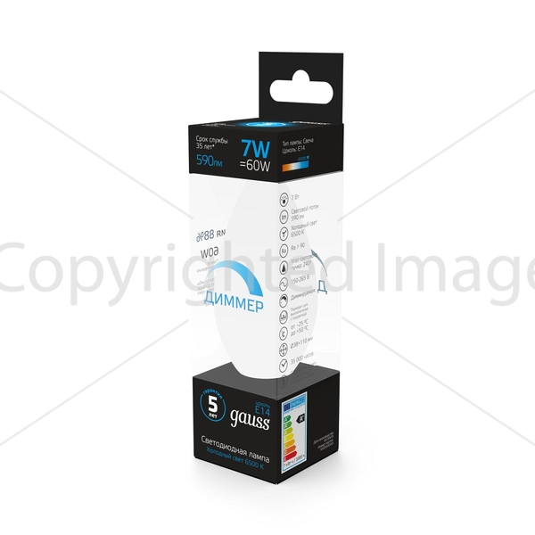Светодиодная лампочка .в форме свечи с цоколем E14 и размерами 105 мм по высоте и диаметром в 35 мм обладает мощностью в 6 W, благодаря чему она может осветить 2 кв. м. Цветовая температура – 6500 К, т.е. холодный свет синего оттенка (не рекомендуется для применения на кухне, так как искажает цвет готовых блюд). Изделие рассчитано на использование в сети с переменным напряжением в 220-240В.