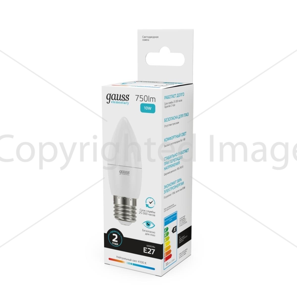 Светодиодная лампочка .в форме свечи с цоколем E27 и размерами 103 мм по высоте и диаметром в 35 мм обладает мощностью в 10 W, благодаря чему она может осветить 3.3 кв. м. Цветовая температура – 4100 К, т.е. белый свет, подходящий для рабочего настроя (не рекомендуется для детской комнаты). Изделие рассчитано на использование в сети с переменным напряжением в 240В.