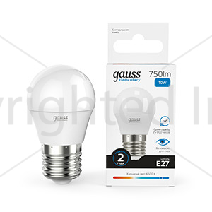 Светодиодная лампочка .в форме шара с цоколем E27 и размерами 74 мм по высоте и диаметром в 45 мм обладает мощностью в 10 W, благодаря чему она может осветить 3.3 кв. м. Цветовая температура – 6500 К, т.е. холодный свет синего оттенка (не рекомендуется для применения на кухне, так как искажает цвет готовых блюд). Изделие рассчитано на использование в сети с переменным напряжением в 240В.