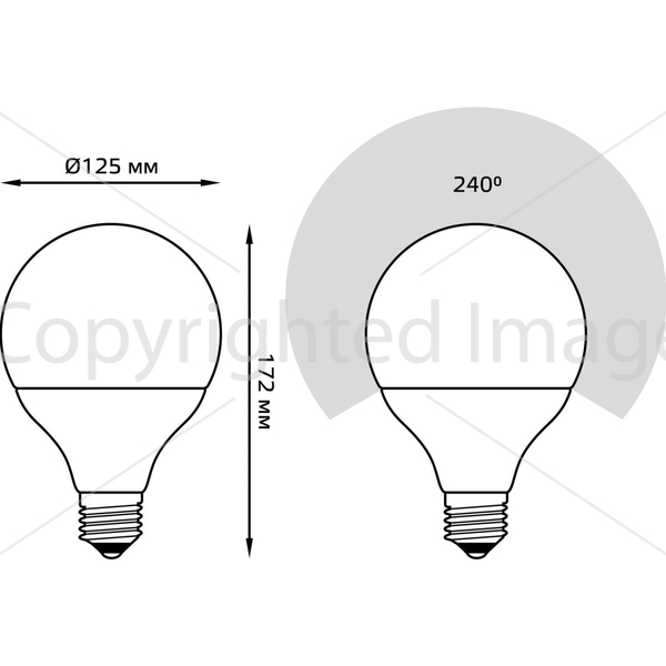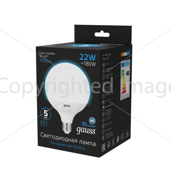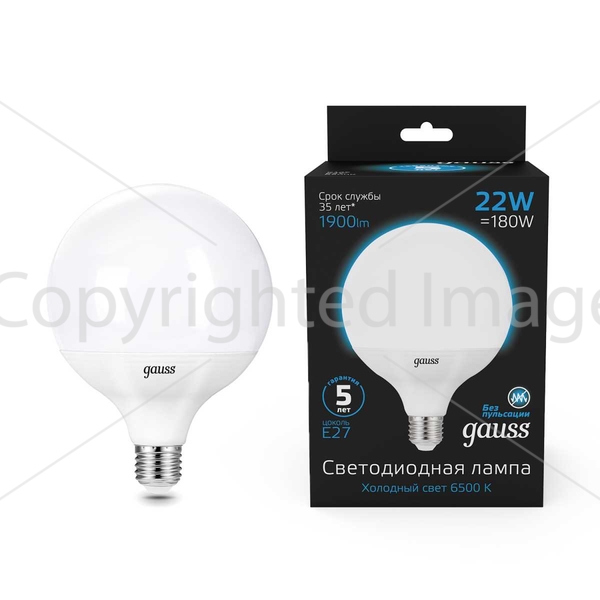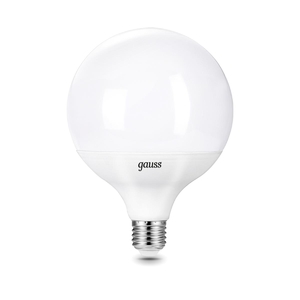 Светодиодная лампочка .в форме шара с цоколем E27 и размерами 172 мм по высоте и диаметром в 125 мм обладает мощностью в 22 W, благодаря чему она может осветить 7.3 кв. м. Цветовая температура – 6500 К, т.е. холодный свет синего оттенка (не рекомендуется для применения на кухне, так как искажает цвет готовых блюд). Изделие рассчитано на использование в сети с переменным напряжением в 240В.