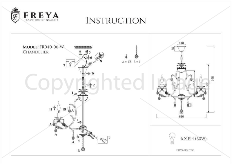 Восхитительная модель FR3040-PL-06-WG от немецкой компании Freya относится к коллекции Dezi и отлично подойдет для установки на потолок спальни, оформленной в стиле прованс. Подвесная люстра Freya Dezi FR3040-PL-06-WG без плафонов осветит помещение площадью 20 кв. м. Производитель Freya рекомендует использовать для устройства лампы накаливания с цоколем E14 и мощностью 60 W. Прибор произведен с использованием материала: металл и может использоваться для натяжного потолка. Основным цветом товара является белый. Торопитесь сделать заказ в интернет-магазине Top Lamp.