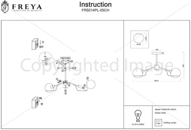 Утонченная модель FR5014PL-05CH от немецкой компании Freya относится к коллекции Sally и отлично подойдет для установки на потолок спальни, оформленной в стиле хай-тек. Потолочная люстра Freya Sally FR5014PL-05CH с круглыми плафонами осветит помещение площадью 11 кв. м. Производитель Freya рекомендует использовать для устройства лампы накаливания с цоколем E14 и мощностью 40 W. Прибор произведен с использованием материалов: стекло и металл и может использоваться для натяжного потолка. Основным цветом товара является серый, серебристо-стальной и дымчатый. Торопитесь сделать заказ в интернет-магазине Top Lamp.