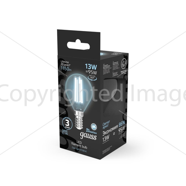 Светодиодная лампочка .в форме шара с цоколем E14 и размерами 78 мм по высоте и диаметром в 45 мм обладает мощностью в 13 W, благодаря чему она может осветить 4.3 кв. м. Цветовая температура – 4100 К, т.е. белый свет, подходящий для рабочего настроя (не рекомендуется для детской комнаты). Изделие рассчитано на использование в сети с переменным напряжением в 220-240В.